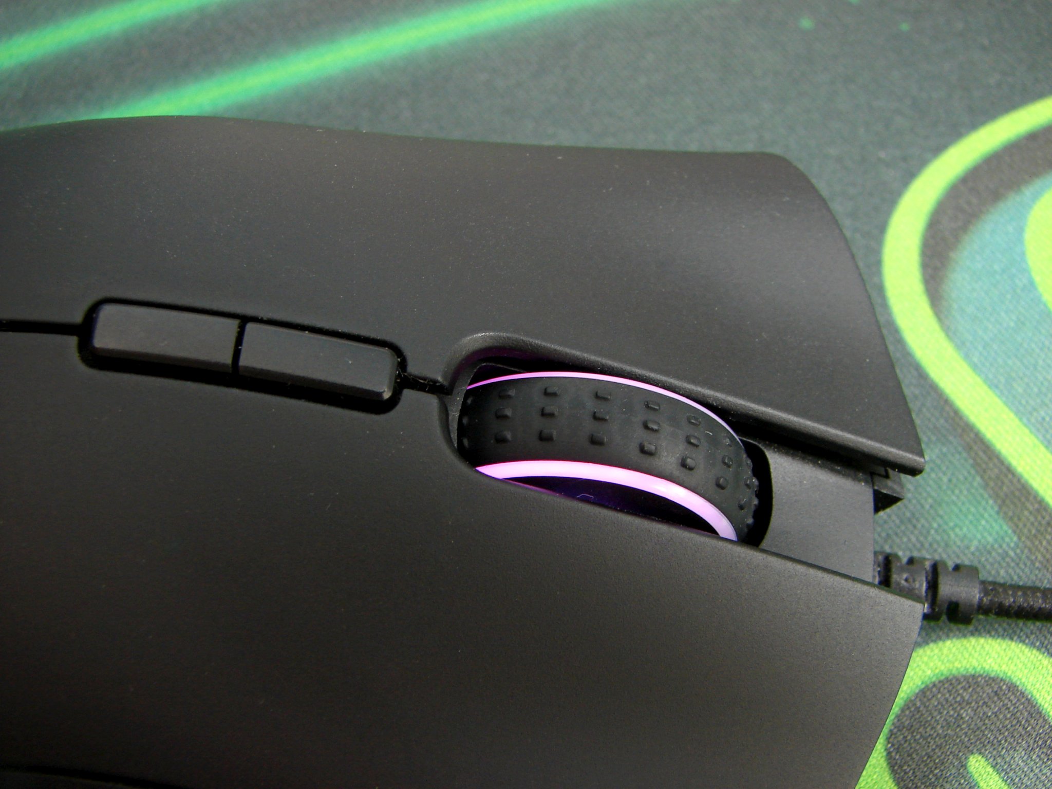 DeathAdder Elite, tak samo jak swój poprzednik – został wyposażony w podświetlenie Chroma (boki rolki oraz logo na grzbiecie), których zachowanie można dowolnie konfigurować w sterownikach Razer Synapse, ale o tym później.