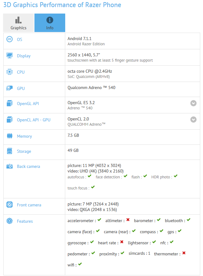 Smartfon będzie pracował pod kontrolą Androida 7.1.1 zmodyfikowanego przez Razera. Ekran urządzenia jest sporych rozmiarów - 5.7 cala i rozdzielczość 2560x1440 (16:9). Sercem jest najwydajniejszy układ Qualcomm Snapdragon 835 z taktowaniem wynoszącym 2.4GHz oraz GPU Adreno 540. Smartfon posiada 8GB pamięci RAM oraz 64GB wbudowanej pamięci na dane (niestety nie ma informacji, czy będzie można ją rozszerzać za pomocą kart microSD), nieznana jest również pojemność baterii. Wiadomo za to, że tylni aparat będzie miał rozdzielczość 12 MPIX - z możliwością nagrywania w rozdzielczości 4K, a przedni 8 MPIX.