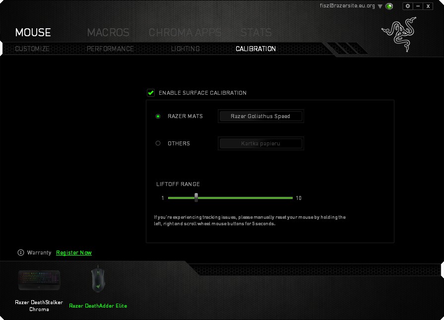 W zakładce Calibration możemy z łatwością zmienić LOD (Liftoff Distance - odległość z jakiej mysz jest w stanie odczytać podkładkę). Dodatkowo można skalibrować urządzenie korzystając z gotowych profilów (dostępne tylko podkładki Razera) lub skorzystać z ręcznej kalibracji.