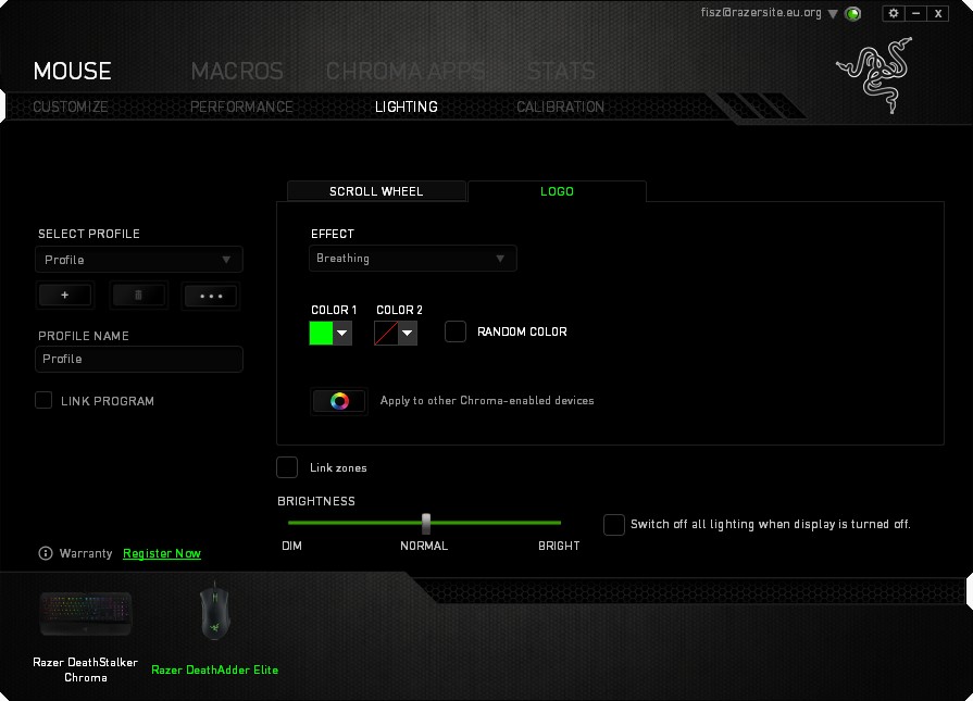 W zakładce Lightning znajdują się wszystkie ustawienia podświetlenia myszy. Można dowolnie wybrać jasność podświetlenia (lub całkowicie je wyłączyć) oraz efekty Chroma tj: Spectrum Cycling (płynne przejście przez wszystkie kolory), Breathing (efekt „oddychania” znany z poprzednich wersji DeathAddera), Static (statyczne podświetlenie jednym kolorem) oraz Reactive (podświetlenie dowolnym kolorem przy naciśnięciu dowolnego przycisku).