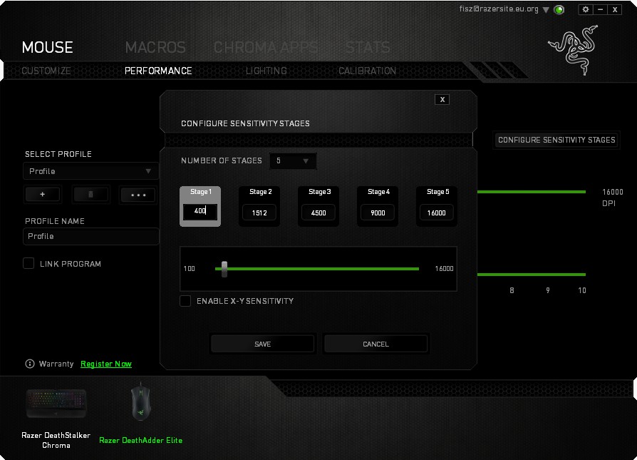 W zakładce Performance jest możliwość ustawienia czułości myszy (DPI), akceleracji oraz częstotliwości raportowania (125, 500 i 1000Hz).