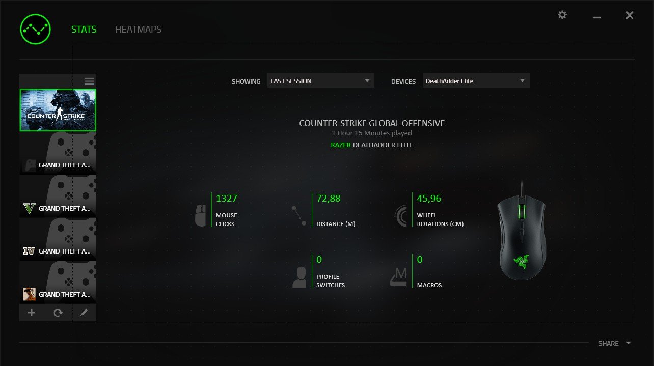 Oprogramowanie umożliwia również tworzenie statystyk – pokazując np. ilość kliknięć, przebyty dystans, ilość użyć makr itp. w podziale na gry zainstalowane w systemie. Można również włączyć „heatmapy”, pokazujące gdzie najczęściej na ekranie znajdował się kursor myszy.