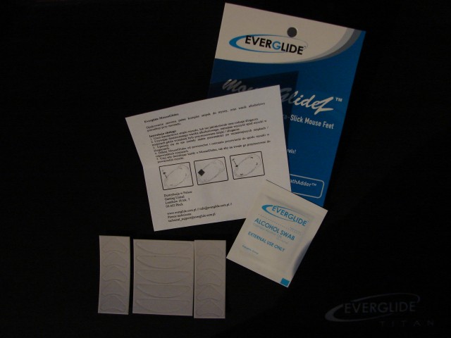 Muszę powiedzieć, że Everglide MouseGlidez wywarły na mnie ogromne wrażenie. W połączeniu z Titanem, mysz śmigała jak po lodzie. Przez to ruchy stały się bardziej płynne, precyzyjne, mniej oporne. Po miesiącu użytkowania ślizgacze wypolerowały się, dając jeszcze lepszy ślizg. Niestety ślizgacze nie są wyższe od tych razerowych i myszka dalej tarła obudową o podkładkę. Na szczęście w opakowaniu znajduje się 5 par ślizgaczy, więc wystarczyło myszkę podkleić dwa razy. Taki „zabieg” nie pogorszył osiągów myszki, za to teraz obudowa nie trze podkładki. O dziwo nie zmieniła się odległość z jakiej mysz jest w stanie odczytać powierzchnię (na Titanie i Eyepadzie 2.4mm przed i po podklejeniu).